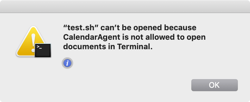 • Programmatically adding an event/alert requires the “Calendars” privacy permission (or “Full Disk Access”).