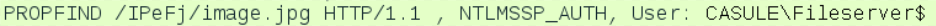 In addition, to take advantage of WebDAV’s server functionality, it was necessary to implement both the OPTIONS and PROPFIND methods in httprelayserver.py. The OPTIONS method is used to inform the client that the PROPFIND method is supported and enabled. It is the PROPFIND request which includes the NTLM authentication and so this the request that will be relayed to perform the attack (an example request is shown in the image below).