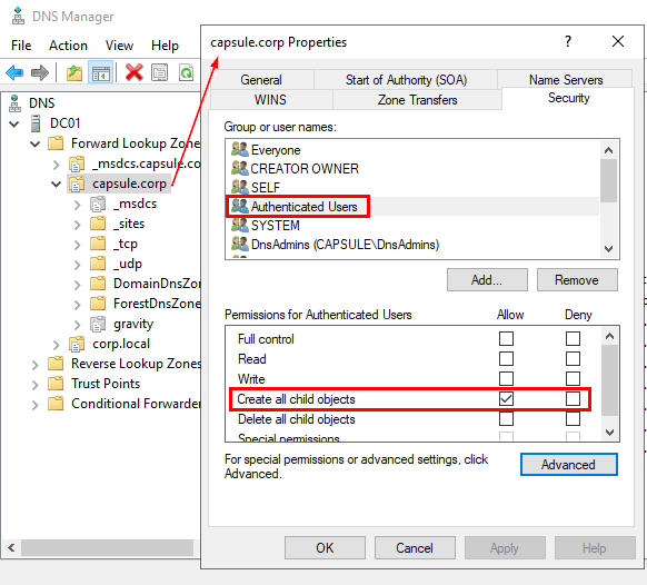 3. By default, authenticated users have the ‘Create all child objects’ ACL on the Active Directory-Integrated DNS (ADIDNS) zone. This enables the creation of new DNS records.