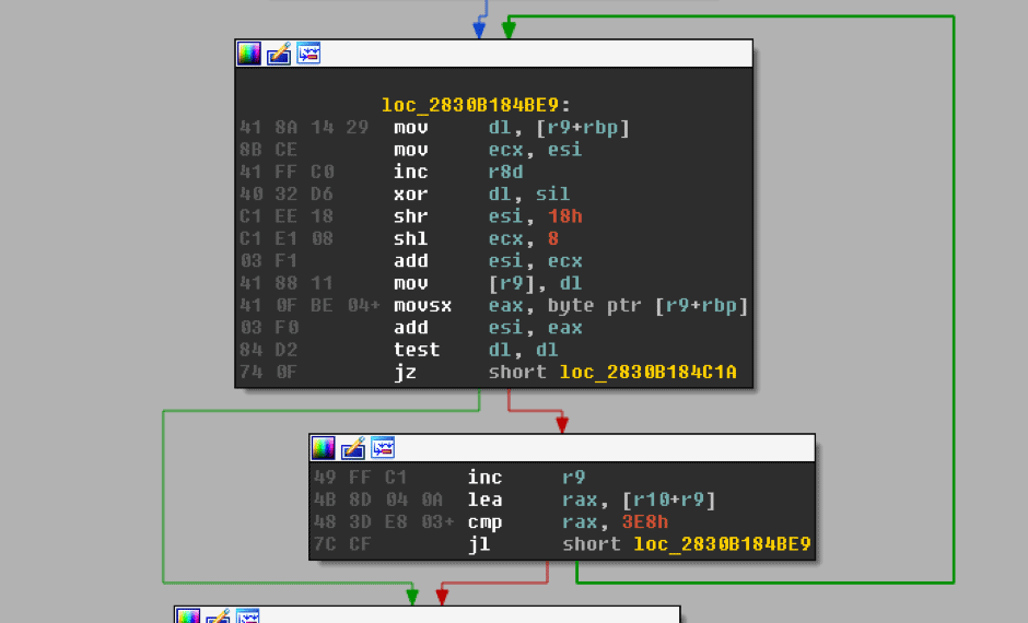 The string decryption function uses a double word key value in ‘r8d’ to decrypt the buffer supplied in ‘rdx’. The loop rotates through each byte in the key, xor-ing the least significant byte with a byte in the supplied buffer.