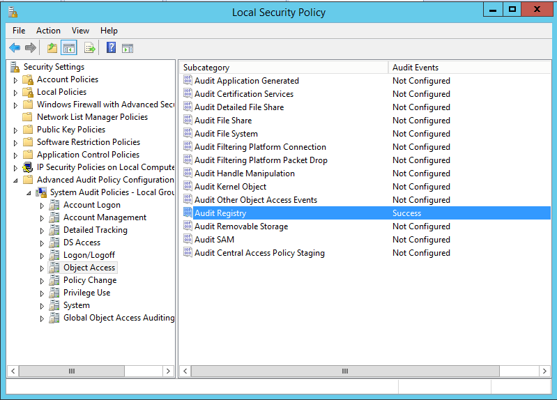 This can be achieved by setting up “Object Access Auditing” in Group Policy. This should be set to Audit Registry access as shown below: