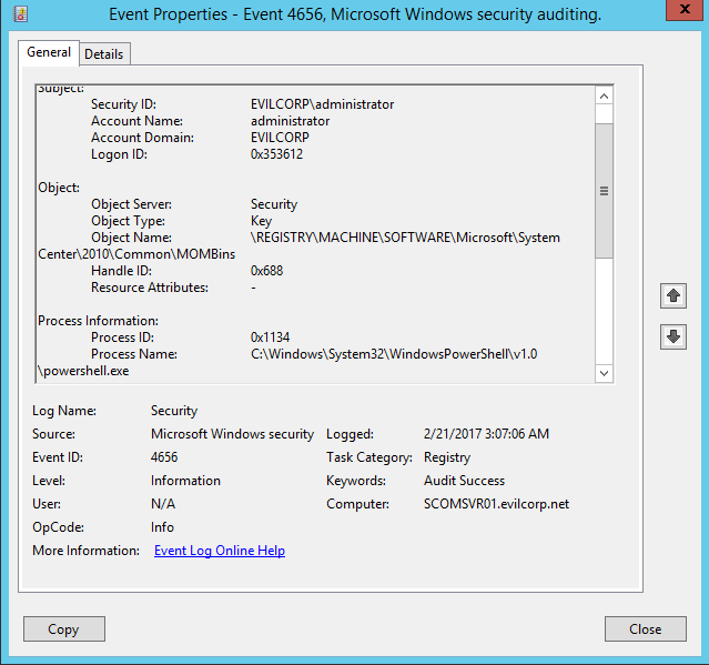 This event shows that the user “EVILCORPAdministrator” attempted to access the MOMBins registry key, from the powershell.exe process: