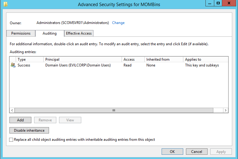 Once enabled in Group Policy, you can then enable auditing by navigating to the MOMBins registry key, right-clicking and selecting “Permissions”.