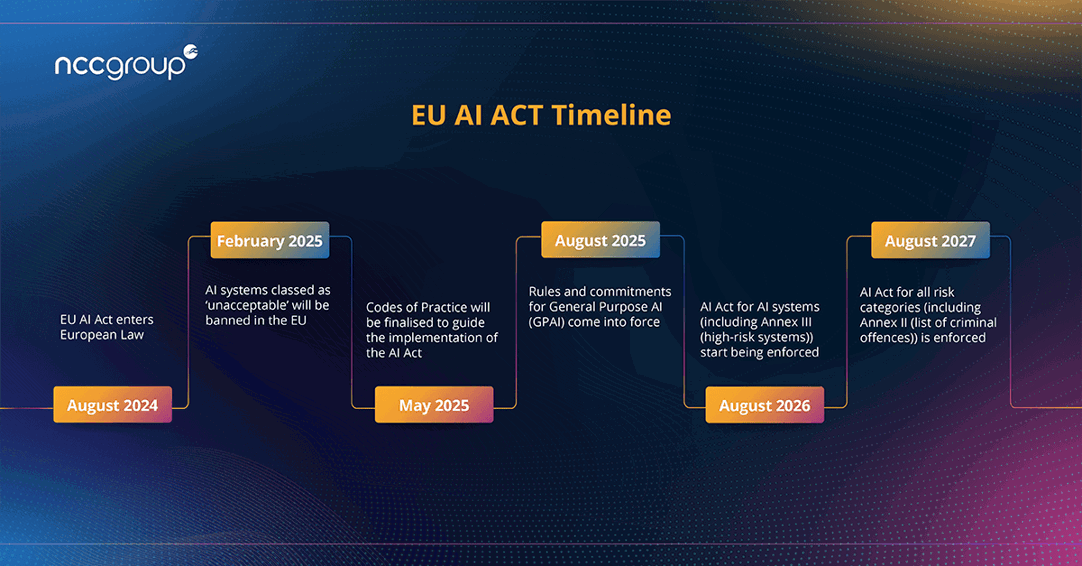 The Act will become fully applicable in August 2027. Still, some aspects of the Act will be applicable sooner, such as the aforementioned ban on unacceptable risk systems, the introduction of the Codes of Practice (May 2025), and the transparency requirements set out in the Act (August 2025).