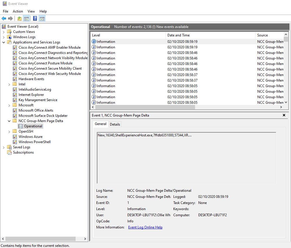 We have a number of data science driven initiatives both in applied research and Managed Detection Response operations related to threat detection. To support these initiatives we need raw telemetry about system behaviors when developing new models. We wanted a way to performantly collect telemetry around changes in executable memory posture to see if we can detect process injection/hollowing among others. The quickest way to prototype this functionality was via a userland process that snapshotted, diffed and wrote the findings to Windows event logging.